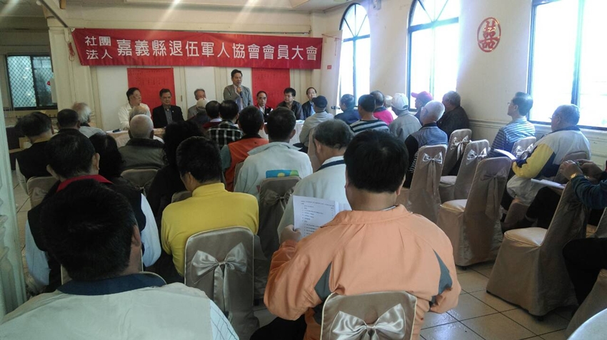 嘉義縣退伍軍人協會於104年12月5日上午,假朴子市大眾餐廳召開第八屆第一次會員大會。由理事長王昌碩先生主持,總會秘書長金國樑代表理事長高仲源應邀出席。大會聽取理監事會工作報告,並改選第九屆理監事。王昌碩理事長在全體與會人員支持下順利當選連任。