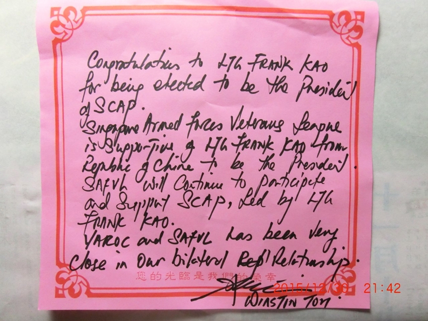 會後Winston Toh 將軍書面表示對高理事長及中華民國退協的支持。書面支持譯文入下: