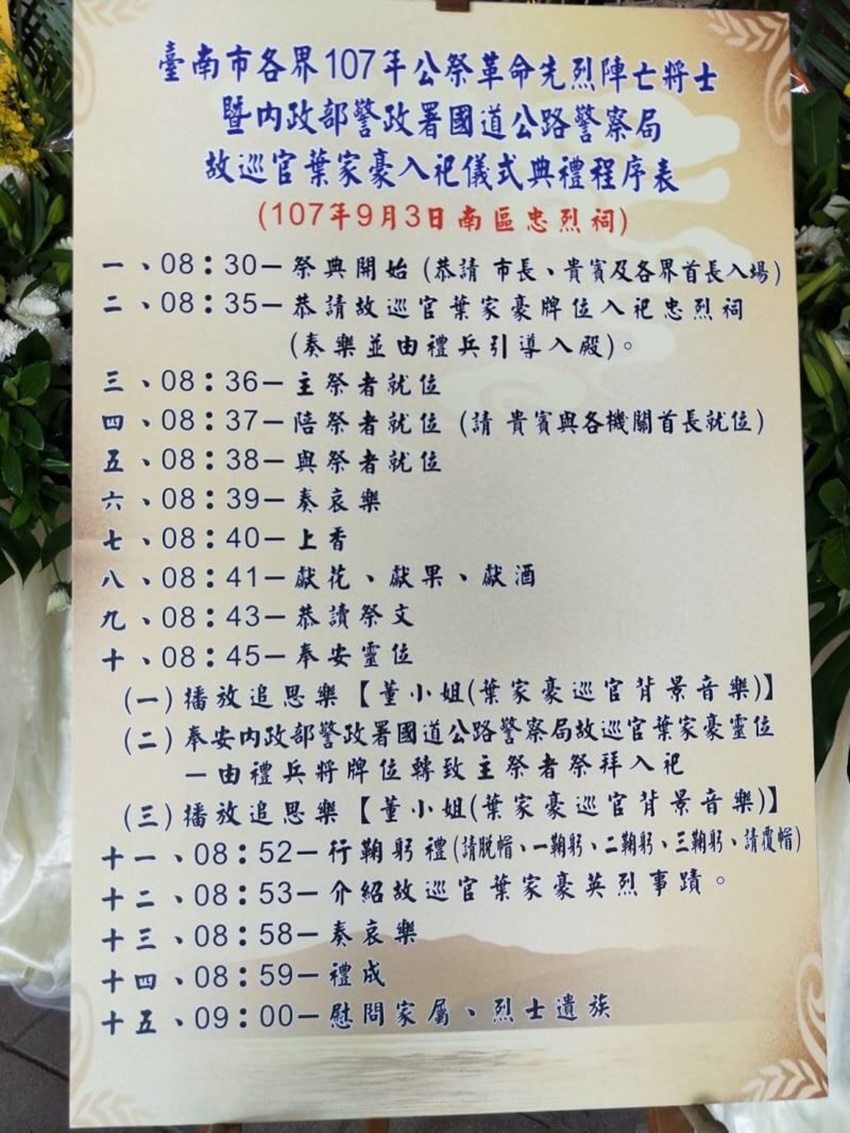 台南市退伍軍人協會於107年9月03日上午8時30分,參加台南市主辦九三軍人節忠烈祠秋祭典禮,由台南市李市長帶領文武百官祭祀。