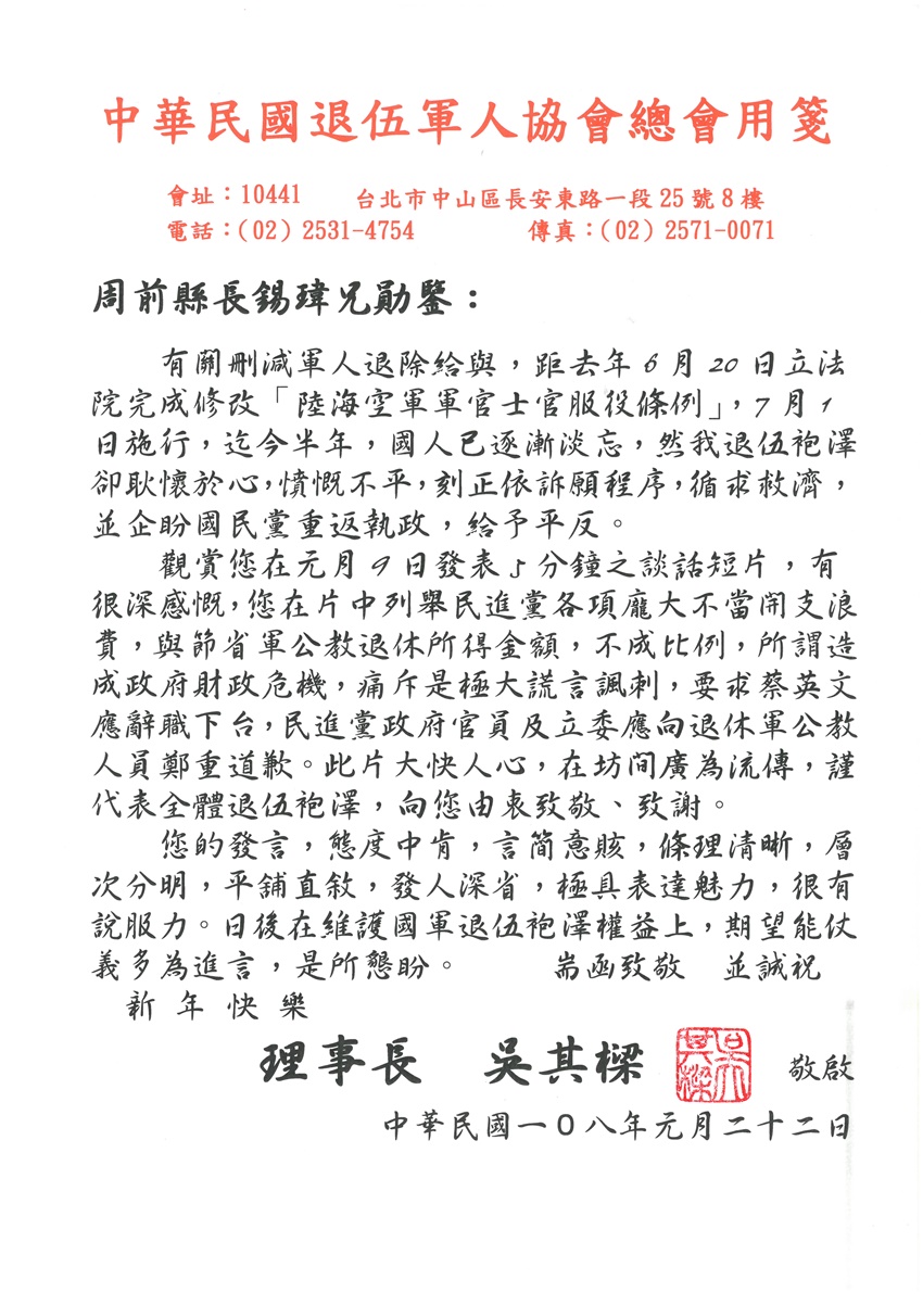 前台北縣長周錫瑋先生於今年1月9日,為軍公教人員遭遇政府違憲、違法刪減退伍給與,在各大廣電媒體仗義執言,並要求執政當局向軍公教人員鄭重道歉,發表了五分鐘電視談話。吳理事長特別於1月22日代表廣大退伍袍澤親函周先生致謝。