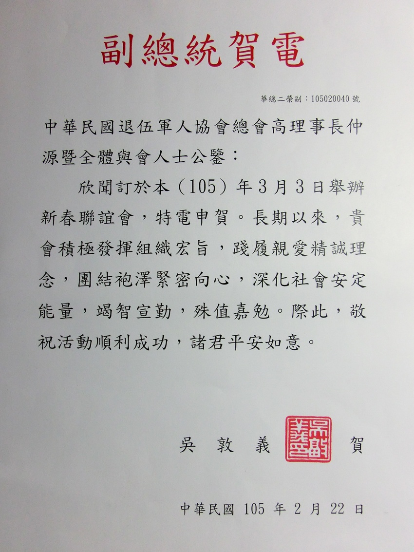總會將於3月3日舉辦105年新春聯誼大會,副總統吳敦義特賀電祝活動順利成功。