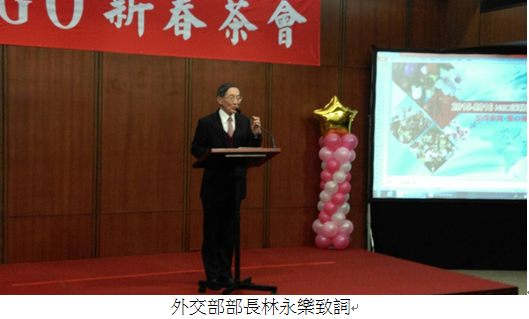本會於105年3月2日(星期三)下午3時,應外交部林永樂部長邀請參加外交部5樓東廳舉行「NGO新春茶會」,理事長高仲源率秘書長金國樑、特助宋海笙等三人參加茶會,理事長高仲源於「NGO新春茶會」中發表致詞。