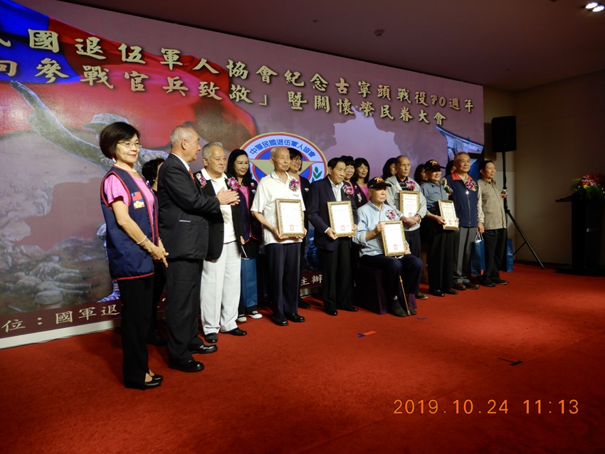 本會於108年10月24日(星期四)上午11時,假台北市鉅星匯國際宴會館,辦理「紀念古寧頭戰役七十周年向參戰官兵致敬大會」,蒞會參加貴賓三百餘人,中央民意代表多人親臨致意,各軍種高階將領,更是踴躍參與。陸軍計有王文燮、陳鎮湘、金恩慶等上將蒞臨;海軍有伍世文、苗永慶、費鴻波、季麟連等上將出席;空軍則有李天羽、夏瀛洲、彭進明、雷玉其等上將參加。盛況空前。