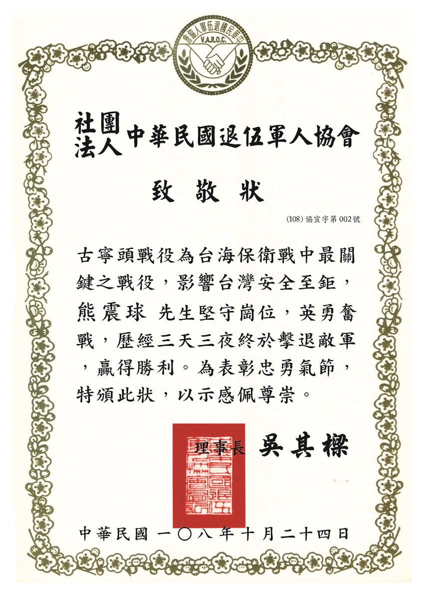 本次大會特邀請當年參戰老兵熊震球先生(隸屬戰車三團第一營第三連第一排,他是戰車射手,38年的古寧頭戰役就是他開的第一砲,作戰56個小時,全程參與,從而改變了台灣的命運)、歐陽鈞先生(隸屬戰車三團第一營第三連第二排,他是戰車射手,全程參與灘岸作戰)、歐曉雲先生、甘其學先生等(隸屬戰車三團第一營修護連,不畏犧牲戰場奔波);另邀請郭興誠先生:(青年軍201師601團,當年奉孫立人將軍派往金門支援前鋒部隊,時年19歲)。另又邀請楊長祥先生:(當年參戰時的幼年兵,之後在軍中成長不斷進修,考進陸官校33期)、勞肇華先生:(當年古寧頭戰役中,陸軍45師師長勞聲寰將軍公子,爾後投身軍旅,進入陸官校33期)及張明初先生(父親時任海軍中榮艦輪機長,馳援古寧頭戰役),共計八位。上述英雄們在一一介紹英勇事蹟後上台,由吳其樑理事長頒發致敬狀及紀念品。