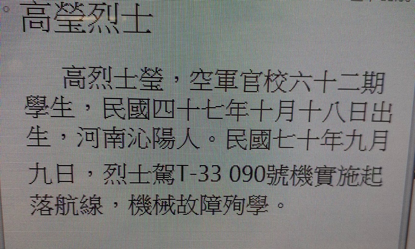 經了解,高老夫人愛子高瑩,係「中國科技大學公共工程科建築組」第十一屆畢業優秀學生(曾獲第四屆大專設計獎及建築師公會建築設計獎),在建築設計專業領域,已經具有相當水準。畢業後,卻立志投考空軍官校,並獲錄取六十二期學生,學習飛行。於民國70年9月9日畢業前夕,駕T-33戰機,實施起落航線訓練,因機械故障失事殉學。