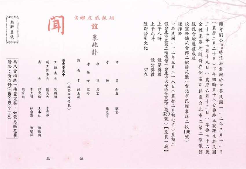 前空軍桃園基地指部指揮官劉勝信將軍公祭奠禮,於112年3月28日(星期二)上午,假台北市第二殯儀館至真一廳舉行。總會吳其樑理事長特派蔣海安副理事長暨會員代表親赴靈堂致祭,並致送高架花籃乙對,以表哀思。