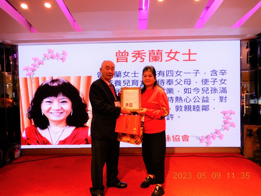 吳理事長致詞時表示:母親節是我們世界上無數個偉大母親的共同節日,這個節日是做兒女對母親的讚美和頌揚,也是提醒我們,永遠要牢記感恩我們偉大的母親,祝福媽媽永遠開心愉快、身體健康;接著吳理事長邀請模範母親們上台親贈當選證書、禮品並一一合照。