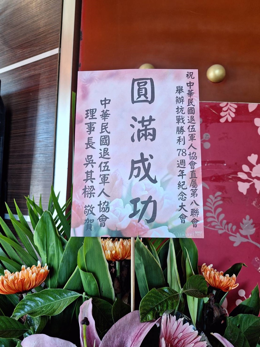 總會直屬第八聯會於112年7月2日(星期日)上午11時30分,假新竹縣湖口鄉芃華國際餐飲文化會館舉辦「抗戰勝利78週年紀念大會」,大會由吳家正理事長主持,會員400餘人參加。總會蔣海安副理事長率行政室游文強主任、彭憲倉副主任出席大會,及致贈高架花籃乙對,以增光彩;蔣海安副理事致詞時闡述抗戰勝利經過歷史,並代表吳其樑理事長敬祝所有會員,身體健康,家庭幸福美滿。