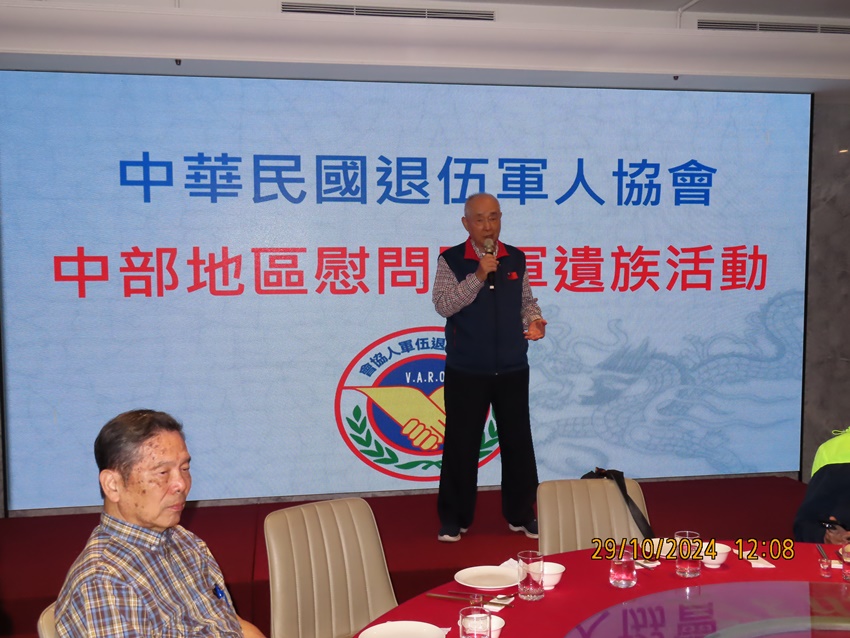 總會吳其樑理事長率副理事長及工作幹部於113年10月29日(星期三)中午,赴台中市北屯區新天地餐廳辦理「慰問國軍遺族暨關懷榮民」活動。台中市楊瓊瓔立法委員、台中市政府民政局張錦富科長(代表市長)、前台中市退協陳天汶理事長、台中市榮民服務處陳宗貴處長暨各地區輔導員等受邀,陪同國軍遺族及榮民眷代表40餘人前來共襄盛會。