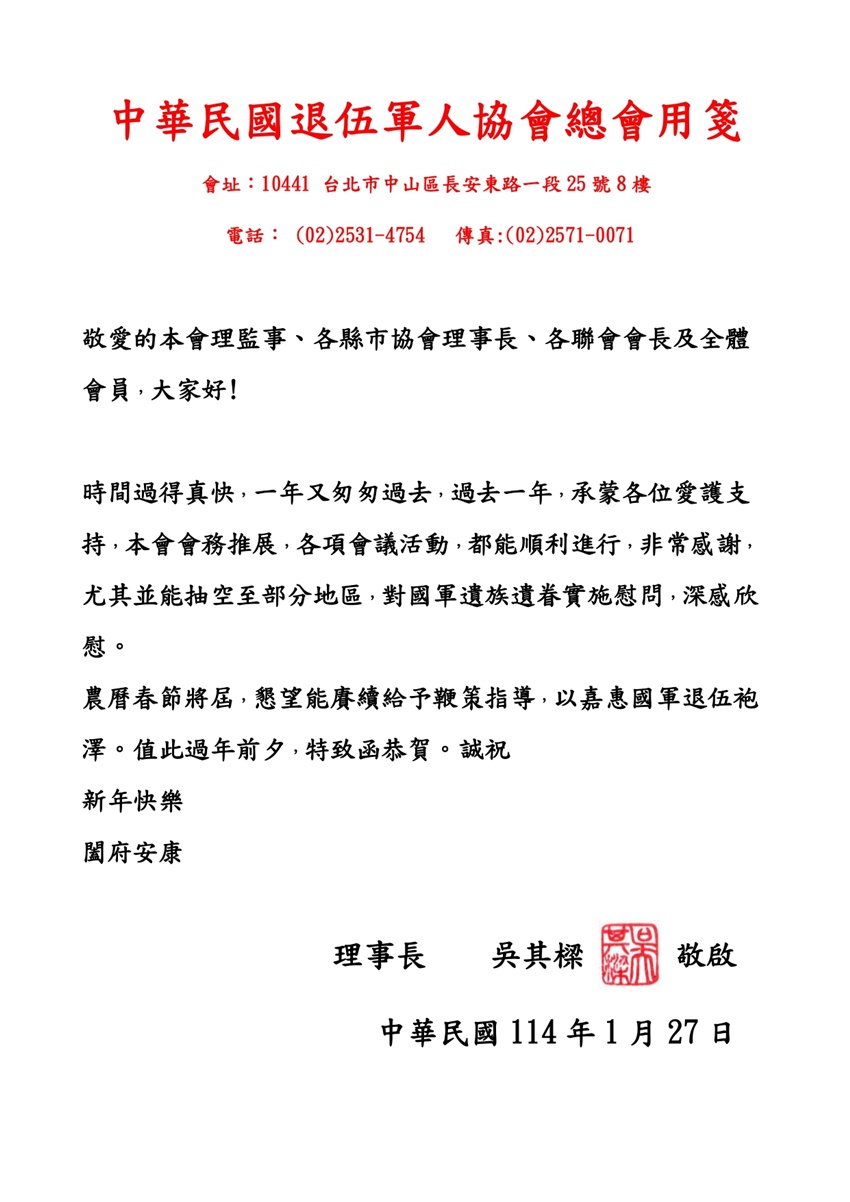 總會吳其樑理事長向會員及退伍袍澤拜年,敬祝大家闔府平安、新年快樂,蛇年行大運!