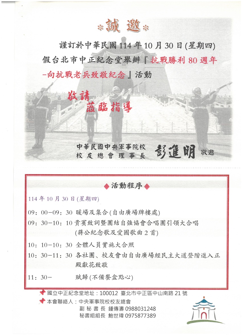 中央軍事院校校友總會於114年10月30日(星期四)上午9時,假台北市中正紀念堂自由廣場牌樓處,舉辦「抗戰勝利80周年-向抗戰老兵致敬紀念」活動,大會由校友總會理事長彭進明上將主持。