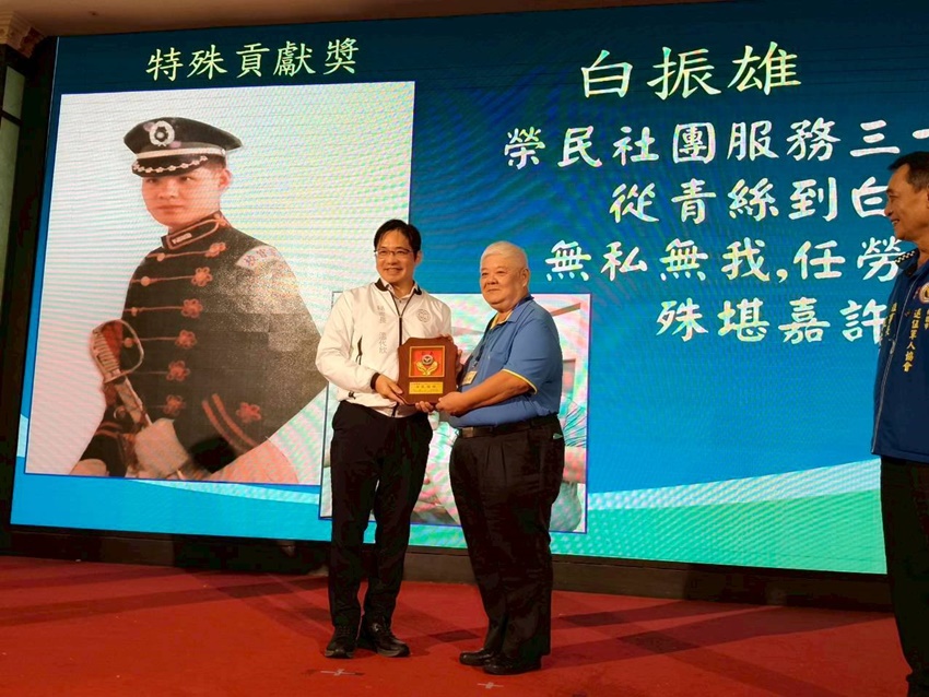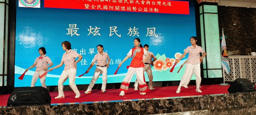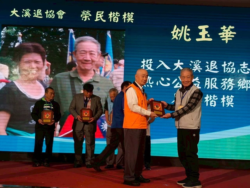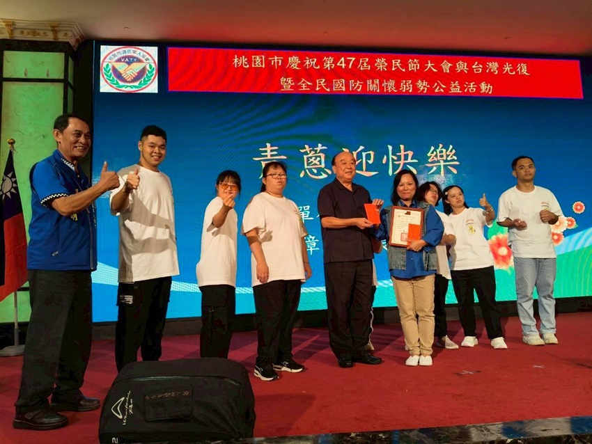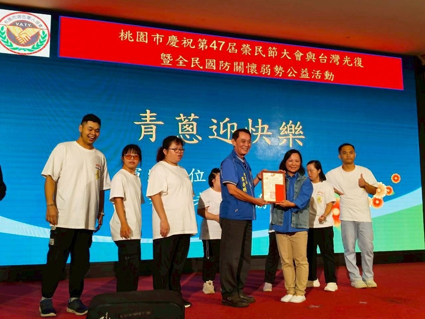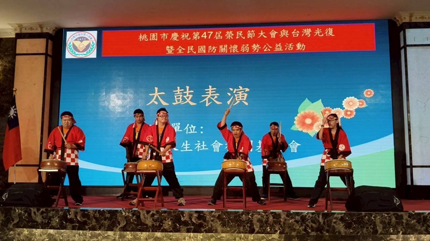 會中革理事長頒發奬牌和精美奬品給年度表現優異的榮民楷模,其中有一位104歲高齡的古老前輩,精神奕奕,令人敬佩!表揚後,接著邀請桃園身心障礙聯盟的代表團體,先是美好社福基金會帶來震撼人心的太鼓表演,接著是智障者家長協會的8位成員,自編自導的舞蹈,個個使盡全力賣力演出,現場觀眾皆稱讚不已,另有雲南僳僳族姑娘精彩演出。活動結束後,總會吳其樑理事長特別致贈身心障礙聯盟團體伍仟元,以示嘉勉鼓勵。
