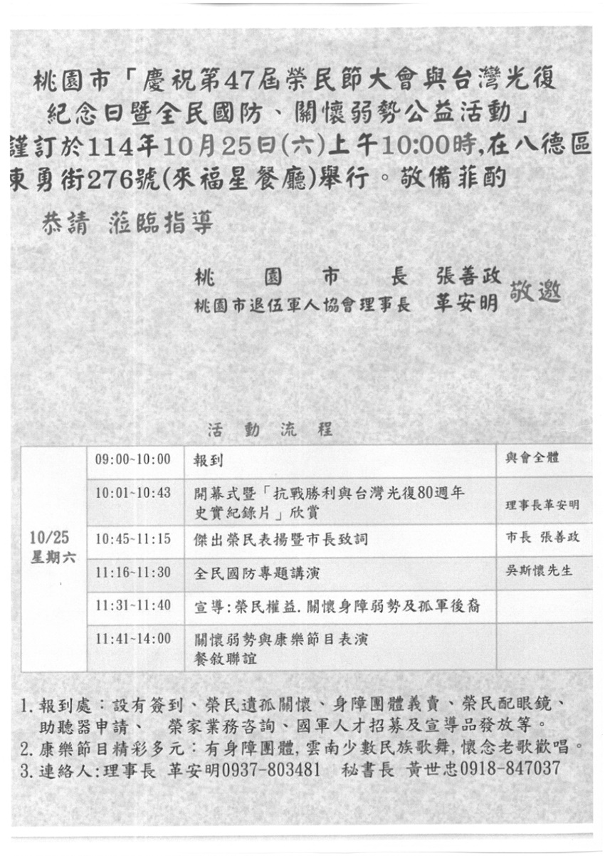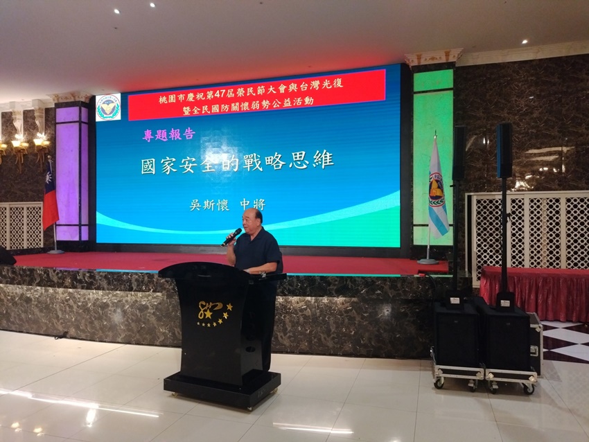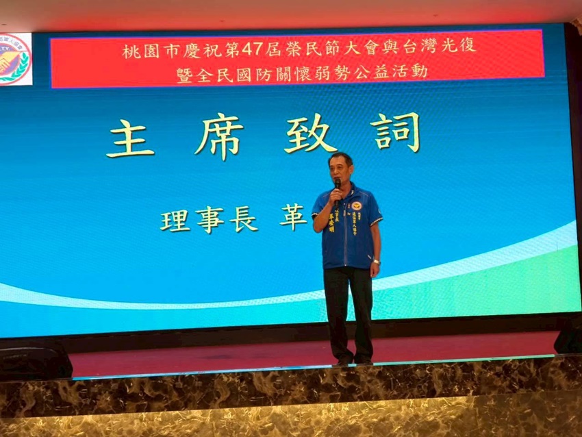 桃園市退伍軍人協會於114年10月25日(星期六)上午,假八德區來福星餐廳舉辦慶祝第47屆榮民節台灣光復暨全民國防關懷弱勢公益活動大會,大會由革安明理事長主持。總會吳其樑理事長受邀參加頒獎並致詞;大會另邀請桃園市政府、榮民服務處等貴賓及聘請前立委吳斯懷中將專題講演:講述國家安全的戰略思維重要性。