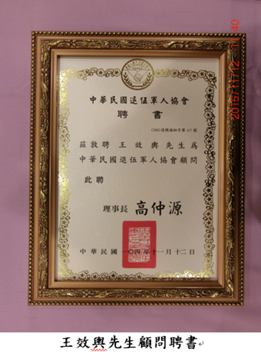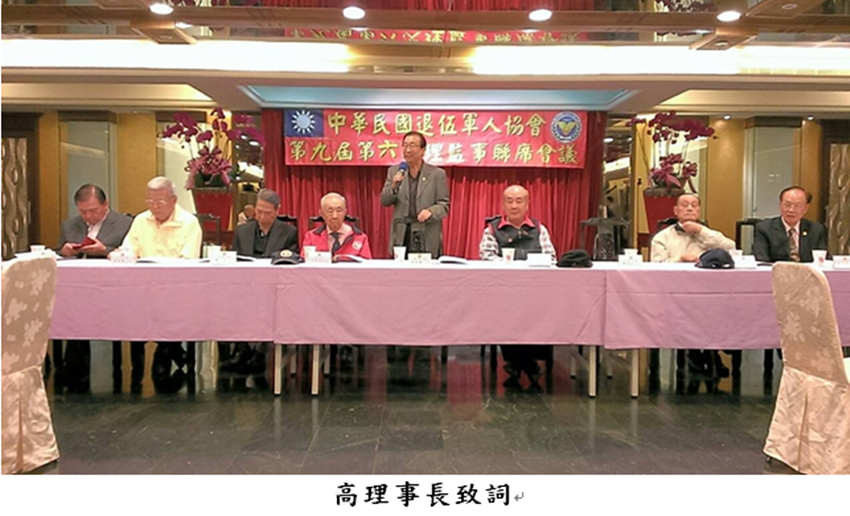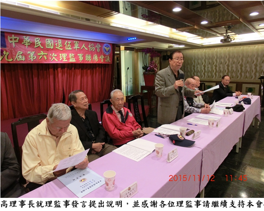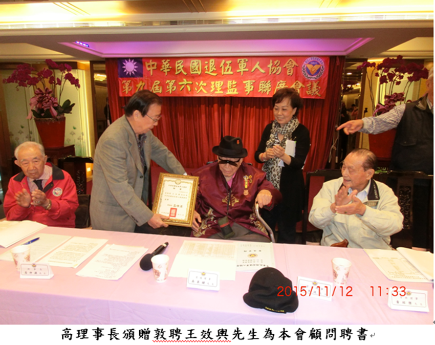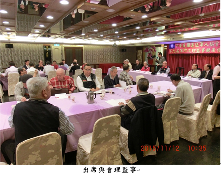 本會於104年11月12日上午,假台北國軍英雄館七樓凱旋廳召開第九屆第六次理監事聯席會議,會中聽取秘書長金國樑工作報告、行政室副主任朱育珣財務報告後,各理監事針對會議資料發言踴躍並提出看法和建言,會後理事長並頒贈敦聘王效輿先生為本會顧問聘書。