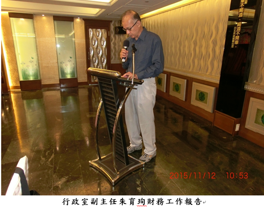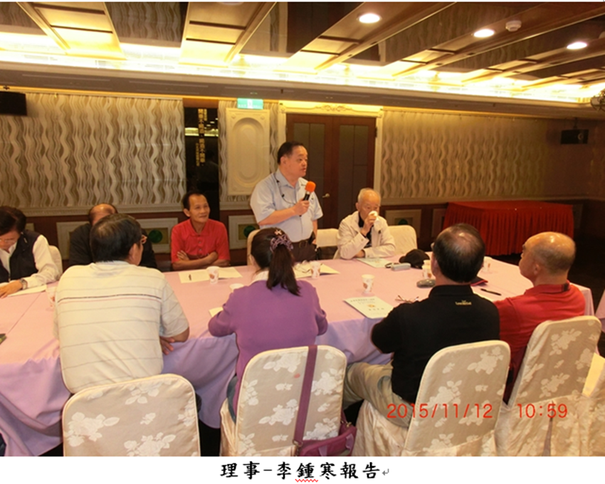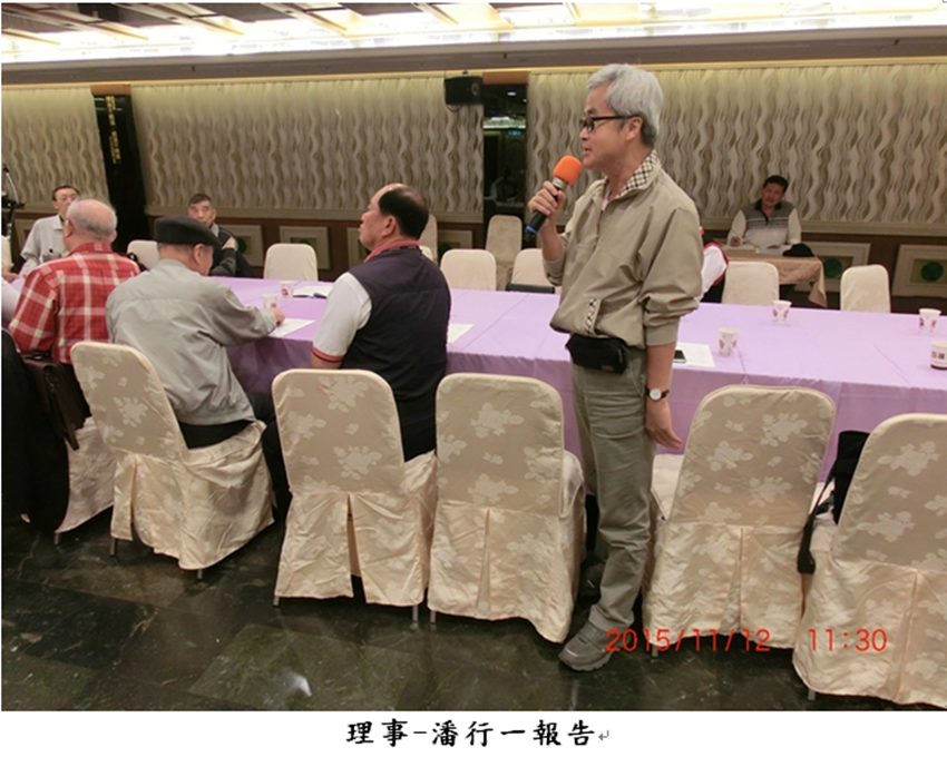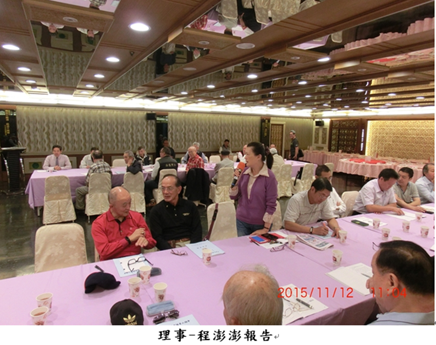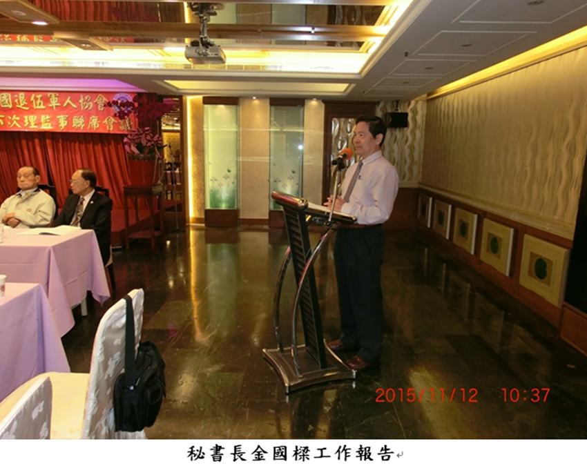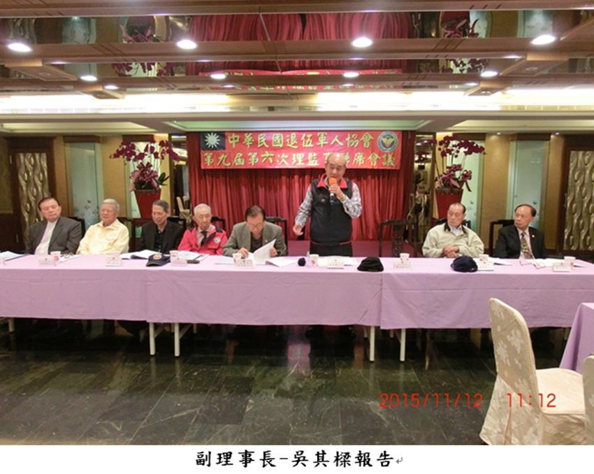 本會於104年11月12日上午,假台北國軍英雄館七樓凱旋廳召開第九屆第六次理監事聯席會議,會中聽取秘書長金國樑工作報告、行政室副主任朱育珣財務報告後,各理監事針對會議資料發言踴躍並提出看法和建言,會後理事長並頒贈敦聘王效輿先生為本會顧問聘書。