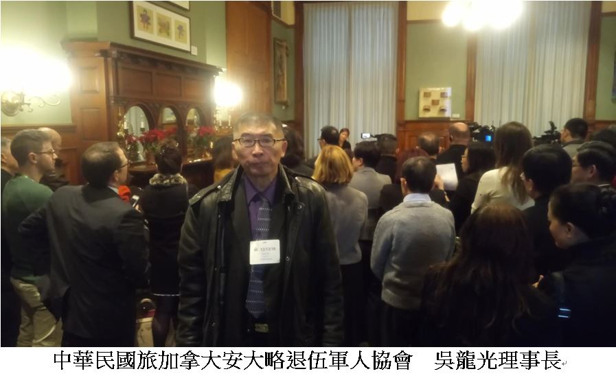 中華民國旅加拿大安大略退伍軍人協會吳龍光理事長獲邀及安省僑界首長一起參加紀念南京大屠殺會議。吳龍光理事長在會中表達:感謝安省政府為了公義和平,設定12月13日這一天為「南京大屠殺紀念日」,使那許多為保衛國家在南京犧牲的將士及30萬亡靈能夠安息,特別致上深深的悼念!