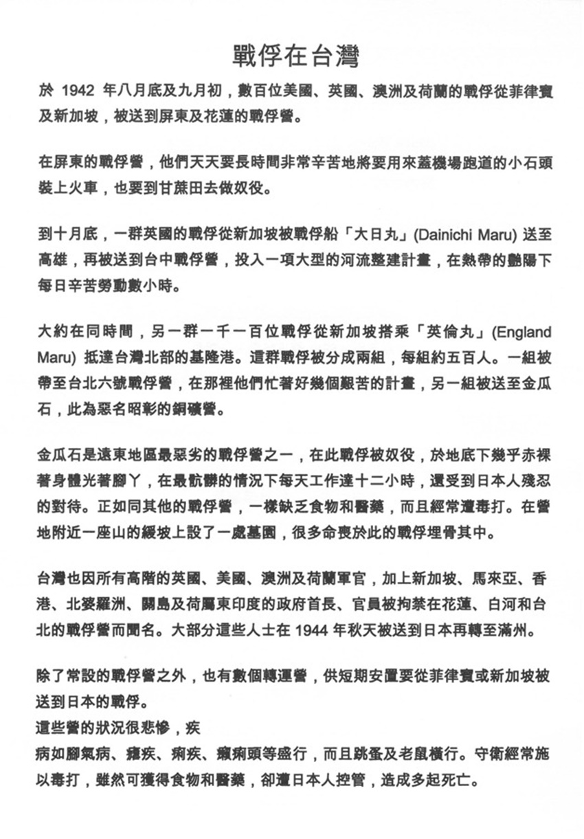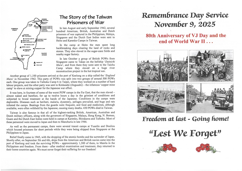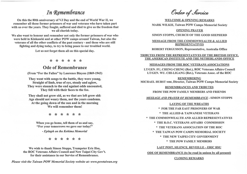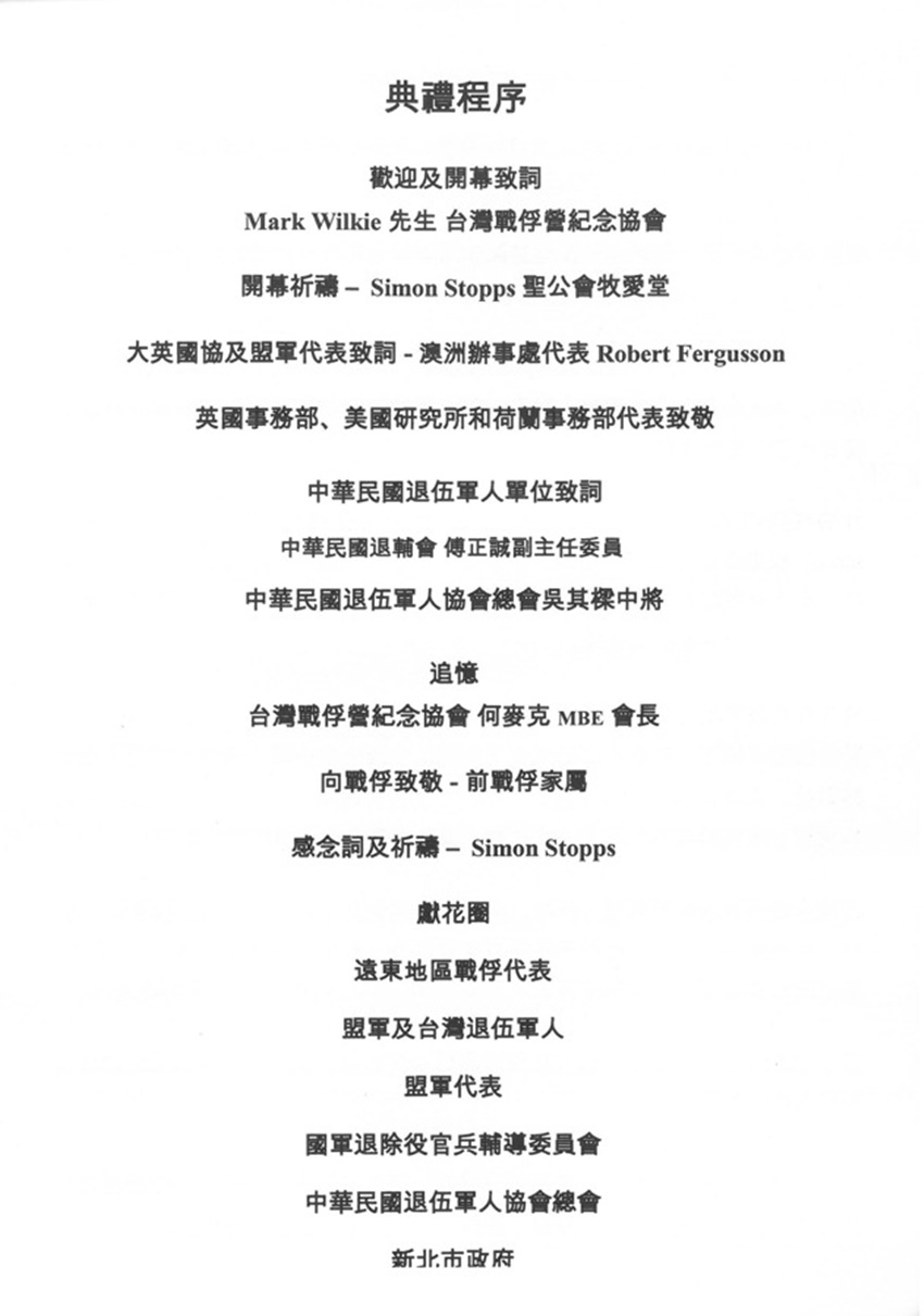 歐戰同盟國包含英國、澳洲、紐西蘭、荷蘭、美國、加拿大等國在台灣代表處,每年均輪流與「台灣第二次世界大戰戰俘營史料協會」共同主辦上述的二戰戰俘追思大會。中華民國退輔會與中華民國退伍軍人協會,雖未列入歐戰同盟國,但因同為服務國際退伍軍人社會之一員,自1986年起成立的該戰俘紀念活動主動協助甚多,甚受該歷史協會重視!