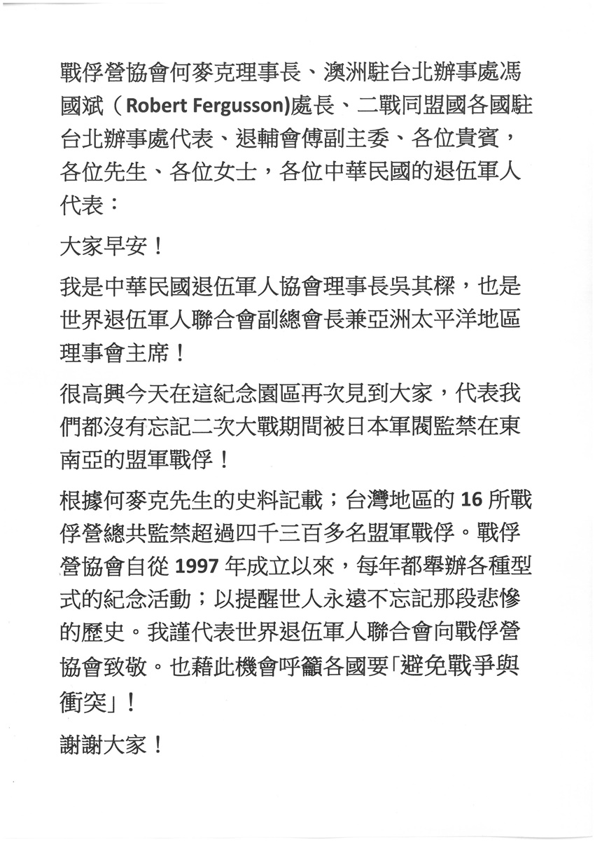 吳理事長對歐戰同盟國輪流主辦的二次世界大戰,臺灣戰俘營紀念園區戰俘追思大會時致詞呼籲:世界各國應唾棄戰爭;因為戰爭沒有贏家;只有經歷戰爭的退伍軍人,才了解戰爭的殘酷!